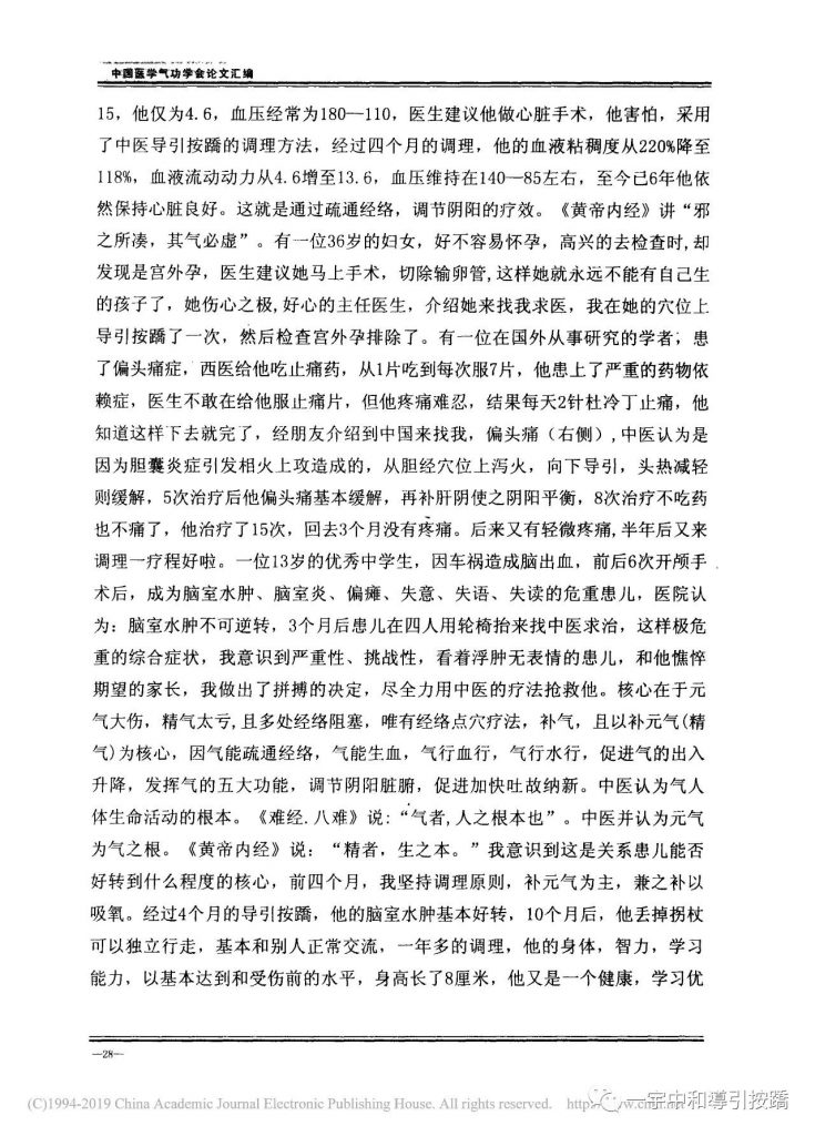 The core lies in the fact that the inborn Qi is seriously injured, the essence is too weak, and many meridians are blocked. Only using the meridian acupoint therapy for replenishing qi, this means to replenish the inborn qi (jing qi) as the core. Because the Qi can dredge the meridians. The qi can produce blood, if the Qi can move, then the blood can flow. If the Qi can move, then the water can flow, so as to promote the rise and fall of Qi which plays the five essential functions of regulating the yin and yang organs. Chinese medicine believes that Qi is fundamental to the life activities of the human body. “Nan Jing Ba Nan” says, “Qi, is the base of humans.” Chinese medicine also believes that Inborn Qi is the root of Qi. The Yellow Emperor’s Inner Classic says, “The essence is the foundation of life.” I realized that this was the core of whether the patient could be better or not. For the first four months, I adhered to the principle of mainly replenishing Inborn Qi. And at the same time I gave supplements to take oxygen. After 4 months of Dao Yin An Qiao treatments, his ventricular edema significantly improved. 10 months later, he lost his crutches and was able to walk independently, he was able to communicate normally with others. More than a year of treatments, his body, intelligence and learning ability, achieved the level before the injury. His height increased by 8 cm. He is again a healthy, excellent student.