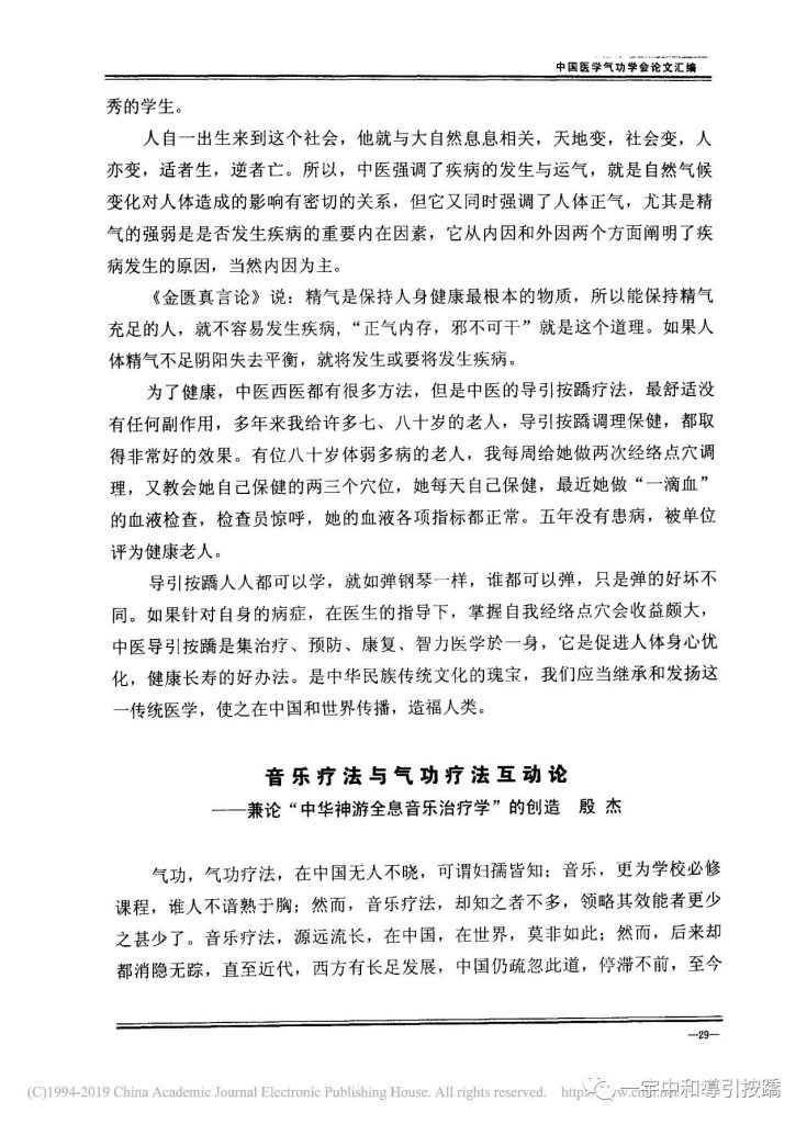 The “JinKui Zhen Yan Lun” says: Essence is the most fundamental substance for maintaining human health. So people who can maintain sufficient essence are not prone to diseases. “If there is sufficient righteous Qi, evil cannot be done” is also true. If the human body lacks essence and loses its balance of yin and yang, it will be sick. For health, Chinese medicine and Western medicine have many methods. But Dao Yin An Qiao therapy of Chinese medicine is the most painless without any side effects. Over the years I have given Dao Yin An Qiao therapy to many seventy- and eighty-year-old people for treatments and health care and have achieved very good effects.